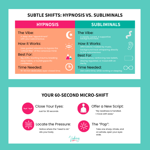 | Best For | Big shifts: rewriting old trauma, breaking deep habits, or building specific confidence (like public speaking). | Maintenance: reinforcing new beliefs, staying regulated during work, or shifting your mood on the fly. |